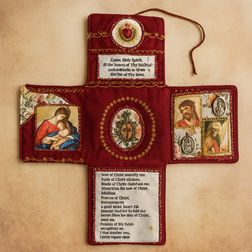 GracePocket™ is a beautifully handcrafted devotional designed to bring peace, reflection, and faith wherever you go. Each piece is sewn with care and purpose, blending spiritual meaning with artisan quality. Compact yet inspiring, it fits easily in your pocket or bag—ready to accompany you in prayer, gratitude, or quiet moments of connection. With rich fabrics, heartfelt prayers, and delicate craftsmanship, GracePocket™ serves as a daily reminder of grace, hope, and divine love.